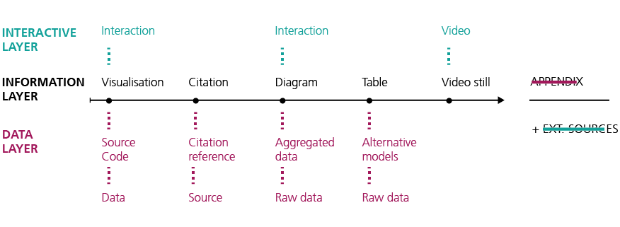 The interactive layer includes multimedia objects as well as interactive and animated elements, such as videos, interactive visualisations, or sortable tables. The data layer enables authors to reference their particular sources directly. This can be supplementary metadata or data resources; for example entire datasets, source codes, citation details, or copyright information. The integration of code and raw data allows the reproducibility of an article and its results. Moreover, the code behind visualisations serves as a valuable tool for co-researchers.